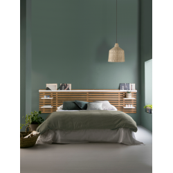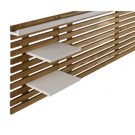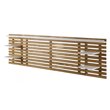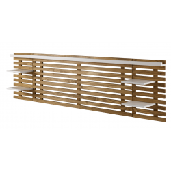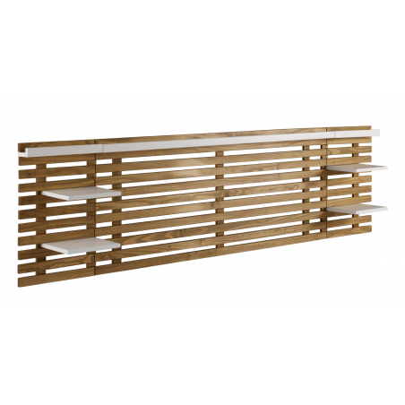 Dama es una gran colección de cabeceros que combina materiales resistentes como la madera de pino maciza y el dm de alta calidad. Es un cabecero compuesto de listones de madera en color blanco y roble, además, dentro de su estructura consta de cuatro pequeños estantes color blanco para colocar cualquier objeto decorativo. Podrás encontrar este cabecero en varios colores distintos para adecuarlo a tu dormitorio.