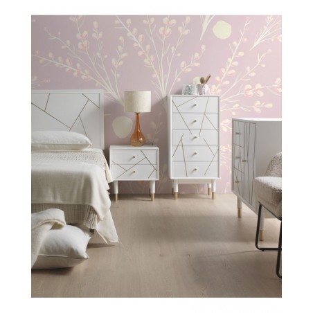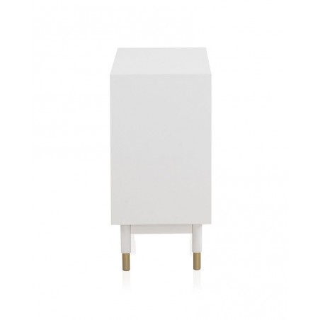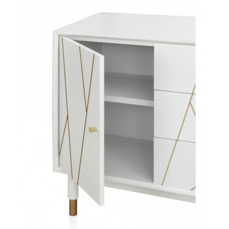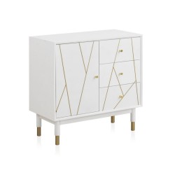 Cómoda 3 cajones 1 puerta lacada en blanco con frontis decorados en oro Modelo Vega, ideal para decorar cualquier ambiente, sus color y diseño asimétrico aportara a su dormitorio frescura y confort, fabricado en madera lacada en blanco mate con frontis decorados en oro s, lo puede combinar con el resto de sus componentes de la colección Vega, crea una estancia única y especial.