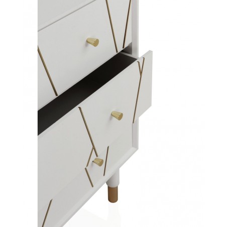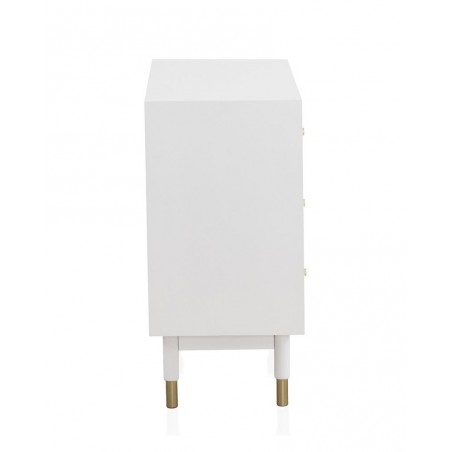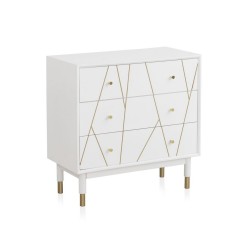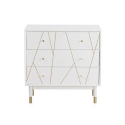Cómoda 3 cajones lacada en blanco con frontis decorados en oro Modelo Vega, ideal para decorar cualquier ambiente, sus color y diseño asimétrico aportara a su dormitorio frescura y confort, fabricado en madera lacada en blanco mate con frontis decorados en oro s, lo puede combinar con el resto de sus componentes de la colección Vega, crea una estancia única y especial.