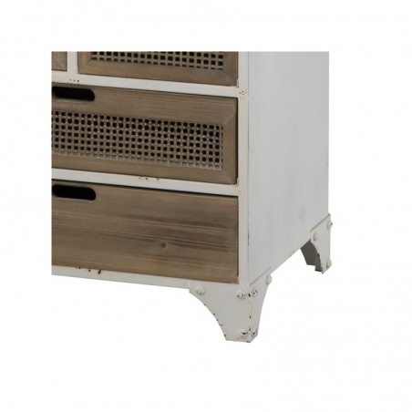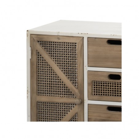 Onixo es un sinfonier que también podrás ubicar en la entrada de tu hogar gracias a su versatilidad. Se compone de una estructura de acero pintada a mano en color blanco envejecido, esto hace que su estilo vintage resalte notablemente. Onixo consta de un amplio almacenaje gracias a sus seis cajones en diferentes tamaños y una puerta frontal, fabricados en madera de abeto con diversos frentes enrejillados para ese toque rustico que tanto nos gusta.