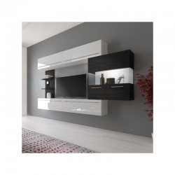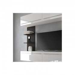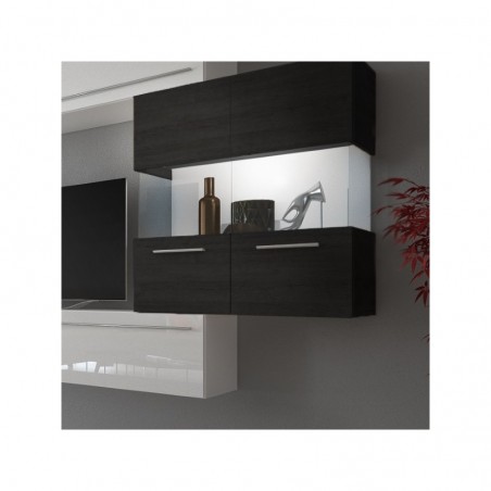Colin es el conjunto de salón que estás buscando si lo que deseas es tener tu hogar a la última moda. Toda su estructura está fabricada en melamina de alta calidad que combina colores como el Blanco Brillo y el color Ébano. Se compone de un módulo inferior y otro superior, un estante vertical con dos baldas y una vitrina con puertas en cristal templado, todo esto lleva tiradores metálicos en acabado cromado y luces leds incluidas.