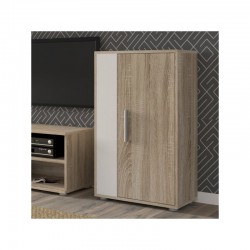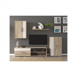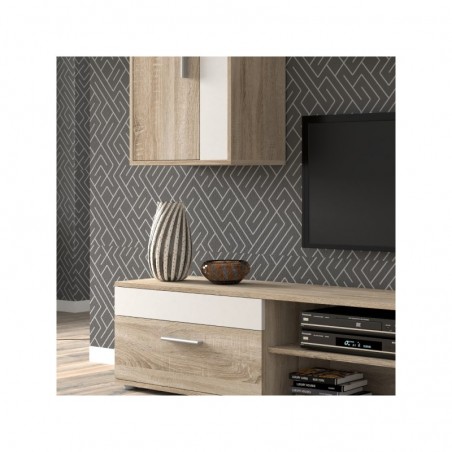 Sett es un conjunto de salón fabricado al completo en laminado sintético de alta calidad combinando colores como el Roble Sonoma y el Blanco Mate. Sett se compone de un mueble para televisión con una puerta y dos huecos, dos vitrinas con una puerta cada una y baldas interiores, y un pequeño estante superior para decorar. Todos estos artículos que componen esta colección para tu salón tienen los mismos materiales y acabados, además constan de tiradores de PVC con acabado metálico.