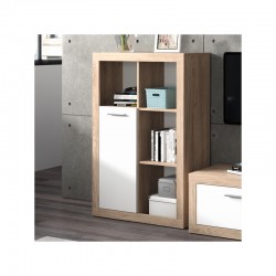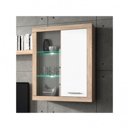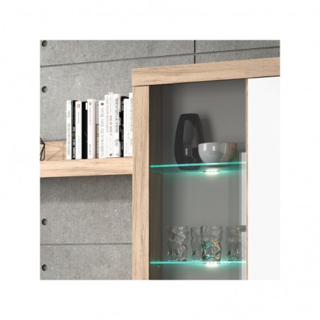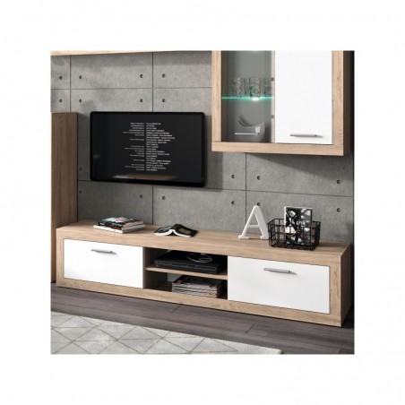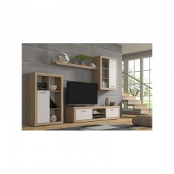 Sunset es un conjunto de salón fabricado completamente en melamina de alta calidad con un precioso acabado en Roble y frentes en color blanco. Todo buen conjunto de salón necesita un gran espacio de almacenaje, por eso, Sunset se compone de dos vitrina con una puerta y baldas, un mueble TV con dos puertas laterales y dos huecos centrales y un estantes de pared, todo esto en el mismo acabado y con tiradores de PVC con acabado metálico. Las luces led van incluidas para una mejor iluminación.
