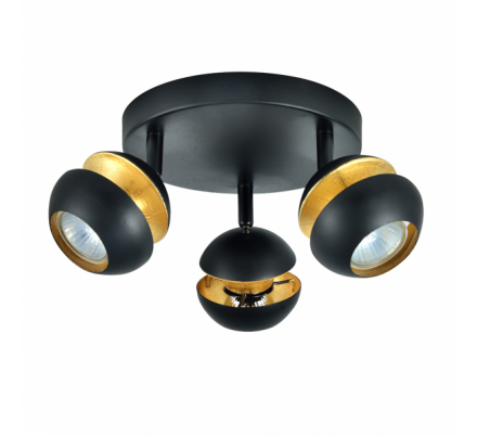 Plafón con tres focos de la serie BEETHOVEN en color NEGRO/ORO. Realizado en metal con tres portalámparas GU10 . Bombillas no incluidas. De diseño moderno y original, combinando el negro con la terminación en pan de oro, con focos redondeados y articulables verticalmente, con un giro horizontal de casi 360º permitiendo así dirigir los puntos de luz hacia cualquier zona de la estancia. Sus dimensiones son 14X22X22 centímetros. Modelo también disponible en color blanco/plata, tanto en su versión de regleta de cuatro luces, regleta de tres luces, regleta de dos luces, colgantes de tres y cuatro luces como en foco de una luz.