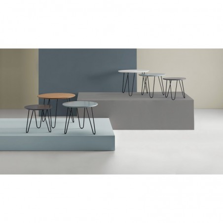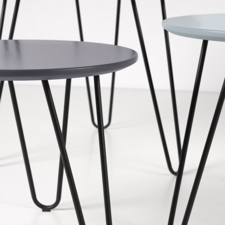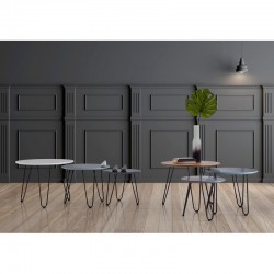 Fabiola es un set de mesas de centro que juega con la altura y los colores en un conjunto de tres mesas redondas con estructura asimétrica. Un set de estilo moderno con colores en tendencia que adaptarás perfectamente a tu decoración.