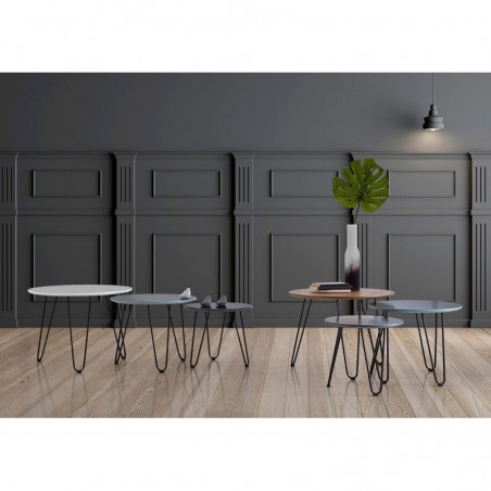 Fabiola se compone de un conjunto de tres mesas para el centro de tu salón en diferentes medidas que podrás acompañar con un gran sofá o sillón. Cada una de ellas consta de un sobre redondo fabricado en melamina de alta calidad en tres colores diferentes; blanco, azul y gris, además, sus patas en acero lacado negro proporcionan resistencia absoluta.