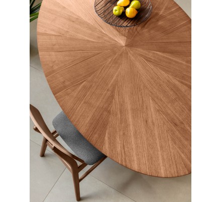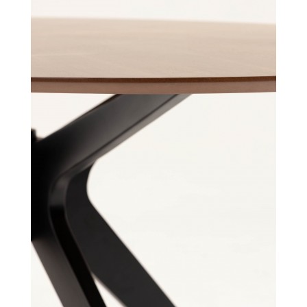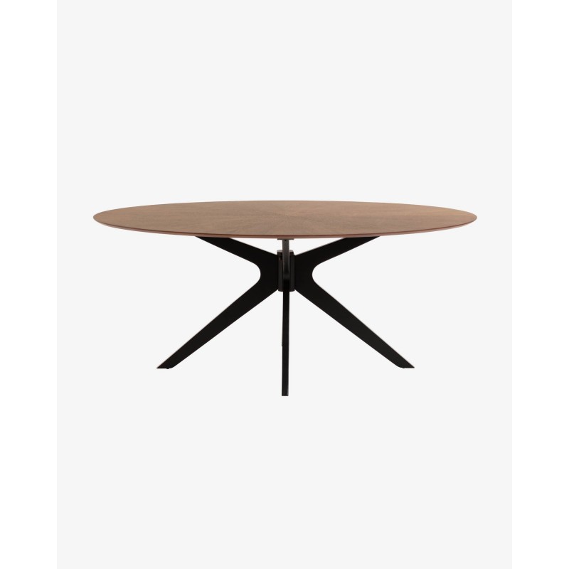Naim es una amplia mesa para salón con un estilo rústico y elegante que, combinándole unas sillas a conjunto, crearás preciosos espacios decorativos para disfrutar en familia. Se compone de un sobre ovalado de 1,8 cm de grosor fabricado en chapa natural de nogal con vetas y tonalidades exclusivas que se unen en forma de estrella. Naim también consta de cuatro patas unidas entre sí en madera maciza de caucho lacadas en color negro.