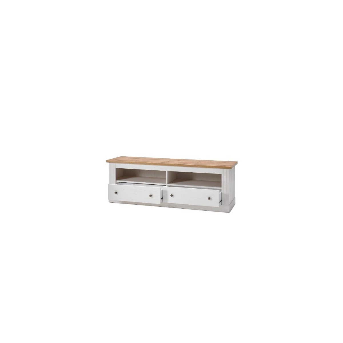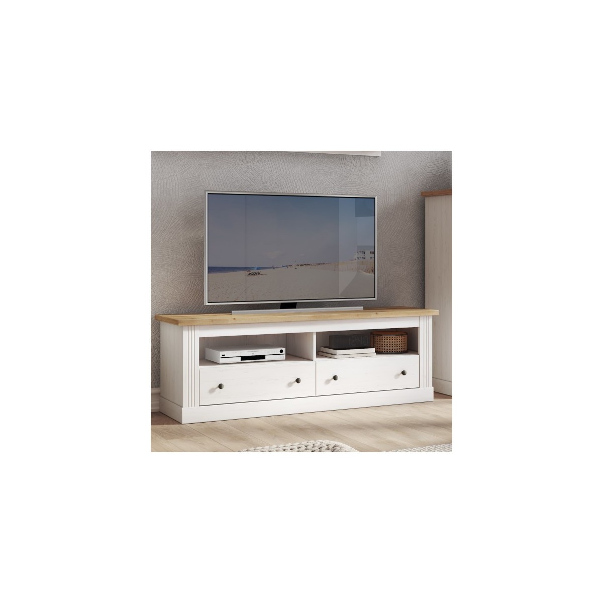 Dentro de la colección modelo West se encuentra el mueble TV, uno de los artículos más destacables. Se compone de un tablero fabricado en melamina de alta calidad en color Roble Aristán texturizado. Para crear una buena combinación de colores, su base está fabricada en el mismo material, pero lacada en color blanco Artik. El mueble TV West consta de dos huecos y dos cajones para un gran almacenaje de productos.