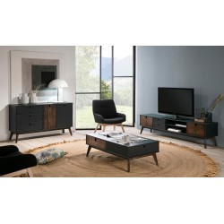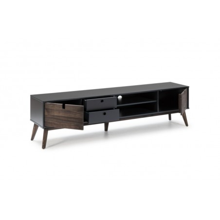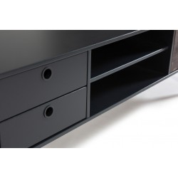 El mueble TV modelo KIA gris antracita fabricado en DM de alta calidad y pino macizo, un mueble de estilo nórdico muy actual y fácil de combinar, se compone por 2 puertas 2 cajones para almacenaje, también dispone de 2 huecos centrales pensados para colocar cualquier aparato electrónico, un mueble practico que a la vez marca tendencia.