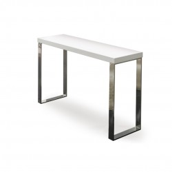 El recibidor modelo 02 se compone de un sobre fabricado en melamina recubierta de madera lacada blanca y dos patas a los lados en forma de cubo rectangular construidas en acero inoxidable.