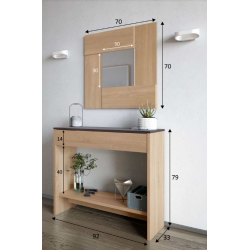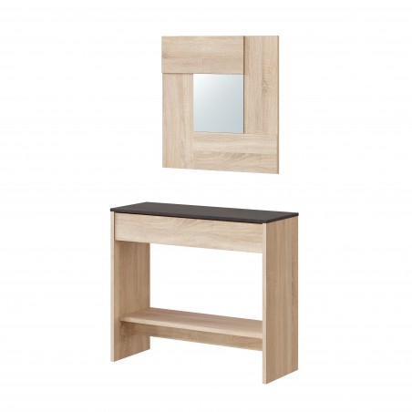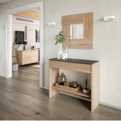 Hi es un recibidor muy estiloso que proporciona firmeza y decoración a tu hogar. Es un mueble sencillo y bonito que se adapta favorablemente a cualquier ambiente gracias a su mezcla de colores en Roble Canadian y Óxido. Está fabricado por una estructura en melamina de alta calidad de 15-22 mm de grosor y cantos pulidos de 0,6 mm. Se compone de un cajón no extraíble y un estante inferior para almacenaje, además incluye un espejo con el mismo acabado que el resto del mueble.
