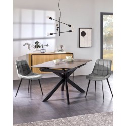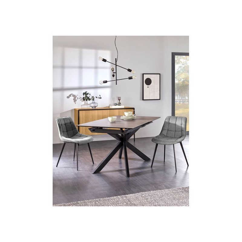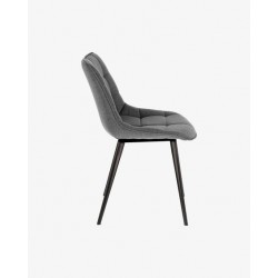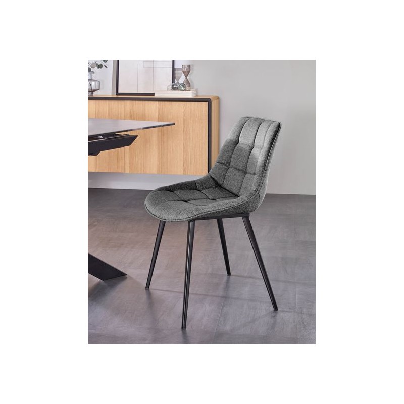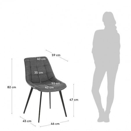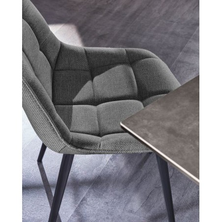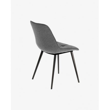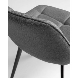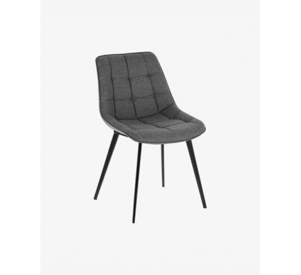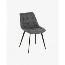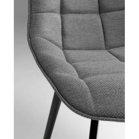 Con su asiento y respaldo acolchados en espuma la silla de comedor modelo Adem se convierte en una silla irresistible y de un gran confort. Esta tapizada en tela de color gris claro con costuras horizontales y verticales haciendo formas para dar ese toque minimalista y decorativo. Además de todo esto, consta de una estructura fuerte y resistente en acero lacado negro.