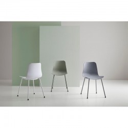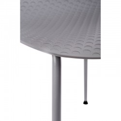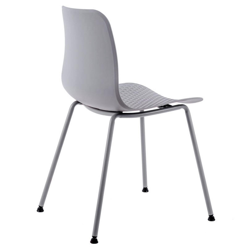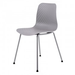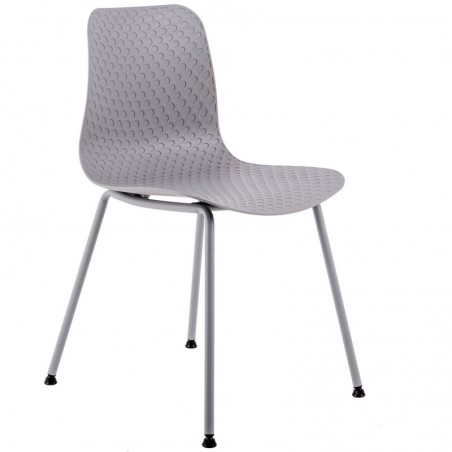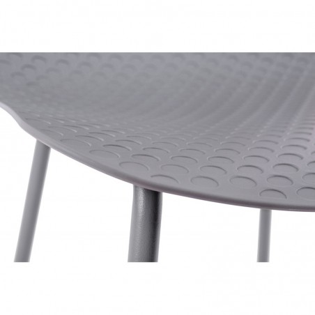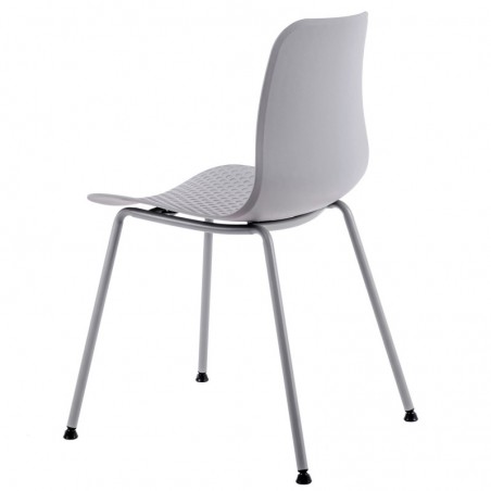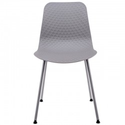 Magan es una silla de comedor fabricada en polipropileno de alta calidad en color gris, un material resistente y con un mantenimiento fácil de sostener. Es una silla funcional con un diseño de óvalos en el respaldo para dar un toque chic a su estilo moderno, además consta de cuatro patas fabricadas en acero lacado gris con tacos antirayas para no dañar el suelo.