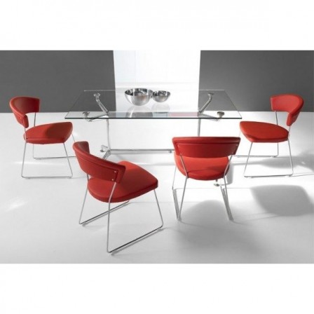 La silla modelo Karen te proporcionará diseño y a la vez comodidad al llevar su asiento y su respaldo acolchados. Se caracteriza principalmente por la forma curva de respaldo que queda perfectamente integrado en  su estructura al ir en una sola pieza. La estructura de esta silla es de acero cromada de alta calidad y su tejido está en realizado en eco piel high quality.