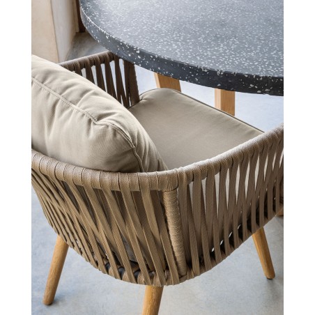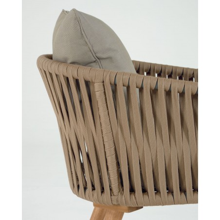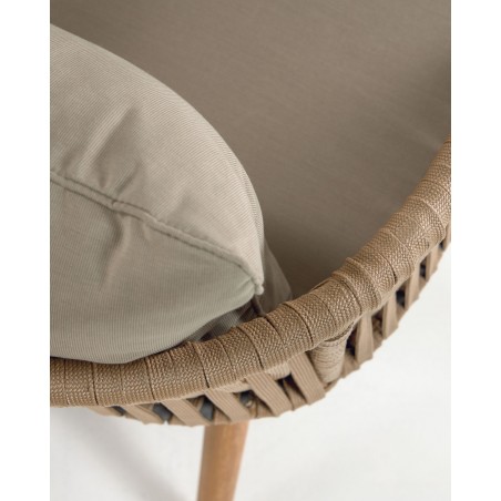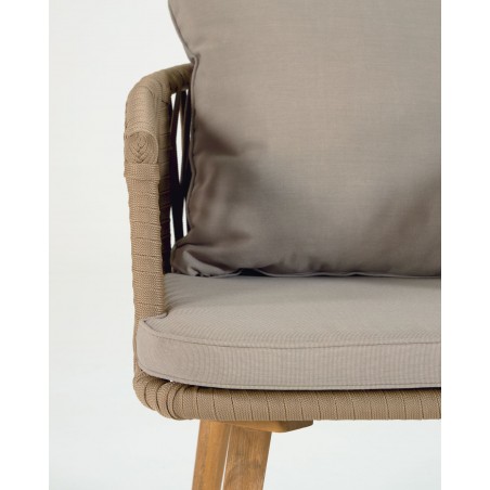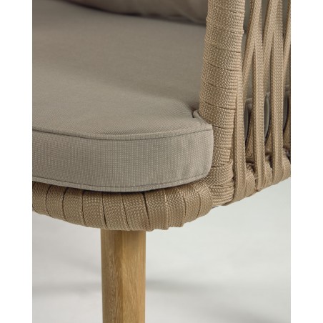 La silla modelo Hemce proporciona resistencia gracias a su estructura fabricada en aluminio resistente a las condiciones climáticas y cuerda color beige, además sus patas son de madera maciza de acacia que proviene de bosques sostenibles y una tala controlada para el bien del medio ambiente. También contiene un cojín beige relleno de espuma en el asiento y otro en el respaldo, para que sea más cómoda a la hora de sentarse, son desenfundables y resistentes al agua en caso de lluvia.
