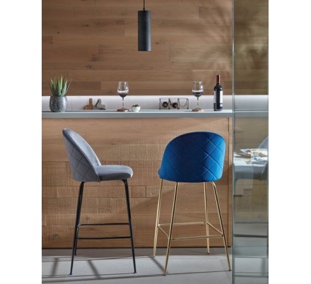 Vonne es un taburete elegante y sofisticado gracias a su diseño tapizado en terciopelo color gris y con respaldo trasero dibujado en rombos. Consta de una estructura contrachapada de bajas emisiones E0 para un mayor cuidado con el medioambiente, rellena de espuma y tapizada en terciopelo de la mejor calidad. Ivonne también está compuesto de cuatro patas fabricadas en acero lacado negro que proporciona resistencia y durabilidad al producto.