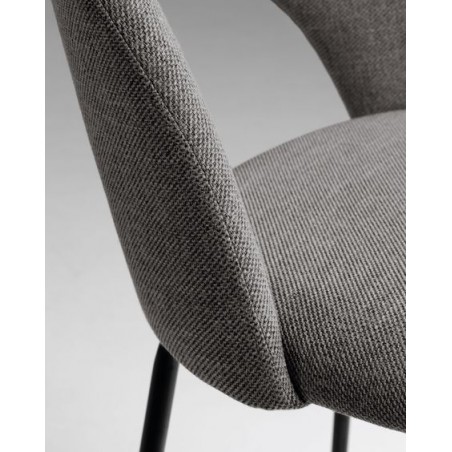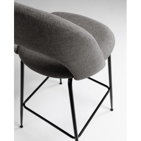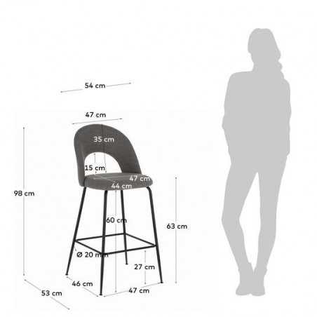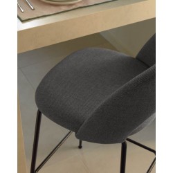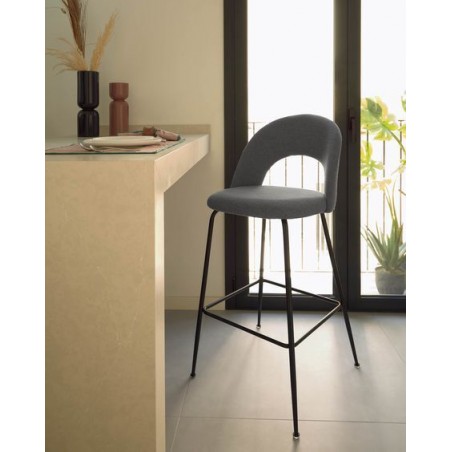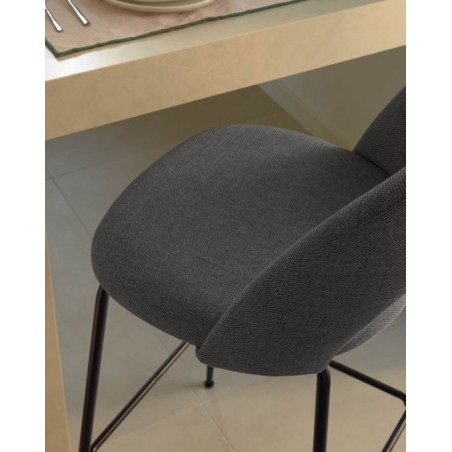 El taburete modelo Malia consta de cuatro patas en acero lacado negro de alta calidad y un asiento y respaldo acolchado en espuma y tapizado en tejido gris oscuro. Este modelo de taburete es uno de los que todos queremos para nuestro hogar por su tejido antimanchas, que se te caiga el café o el vino ya no será un drama gracias a su tela, evita que los líquidos se filtren y es súper fácil de limpiar con tan solo un poco de agua y dejándolo secar.