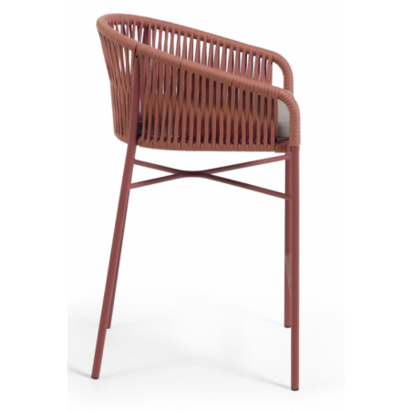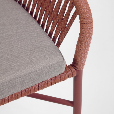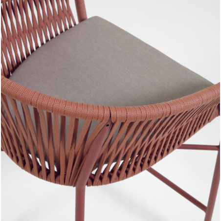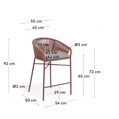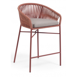 El modelo de taburete Yana está fabricado en acero galvanizado forrado por cuerda trenzada a mano color rosa, además, para un mayor confort se le añade un cojín acolchado relleno de espuma de color gris. Adaptándolo a una buena mesa y con la combinación de sus colores, podrás crear un precioso conjunto tanto en interior, como en exterior bajo techo para poder disfrutar de comidas infinitas.