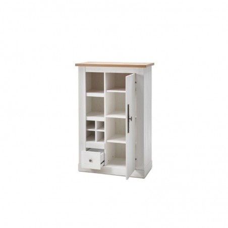 Dentro de la colección modelo West se encuentra el bodeguero, uno de los artículos más destacables. Se compone de un tablero fabricado en melamina de alta calidad en color Roble Aristán texturizado. Para crear una buena combinación de colores, su base está fabricada en el mismo material, pero lacada en color blanco Artik. El bodeguero West consta de una puerta con tres baldas interiores y tiradores metálicos, también tiene un cajón inferior, dos huecos superiores y un estante bodeguero para 4 botellas.