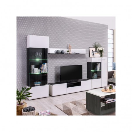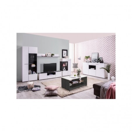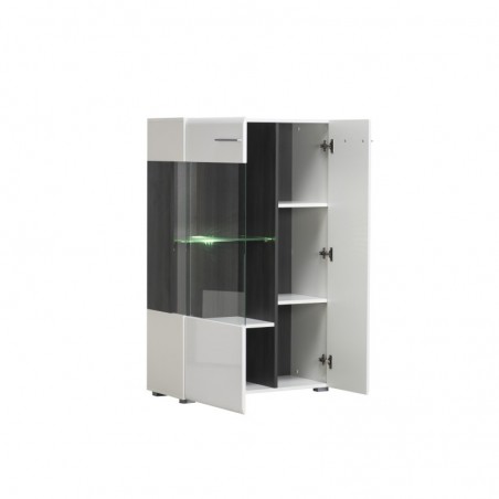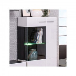 Dentro de la colección de salón Denzo nos encontramos con la vitrina baja, este artículo está fabricado en laminado sintético color ébano y blanco brillo. Dispone de dos puertas, una puerta combinada en cristal y blanco brillo, una balda de cristal vista y otra oculta en blanco, otra puerta con acabado blanco brillo y dos baldas blancas interiores. Lo que más destaca de esta colección es que es resistente a arañazos, golpes, altas temperaturas y humedad, por lo que su durabilidad es mucho más estable que cualquier otro producto.