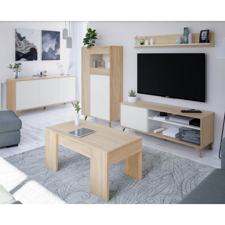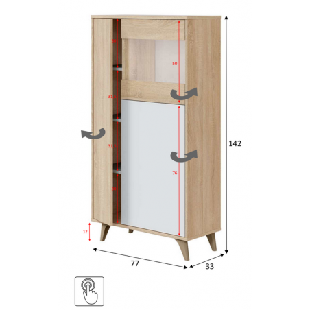 La vitrina modelo Relax está fabricada en melamina de alta calidad de 15 mm de grosor y cantos pulidos de 6 mm, se encuentra lacada en color Roble Canadian y Blanco Artik, dos colores en tendencia que proporcionan amplitud y luminosidad. Además, para un mayor aprovechamiento, esta vitrina consta de tres puertas con apertura push.