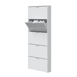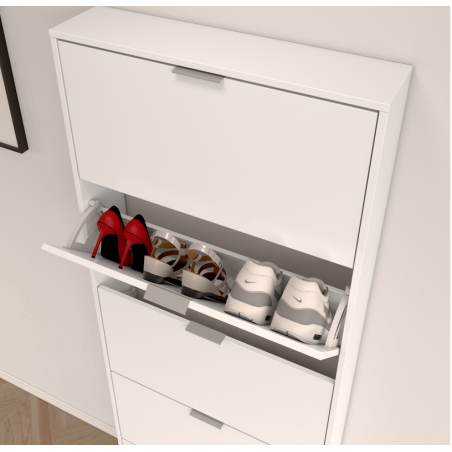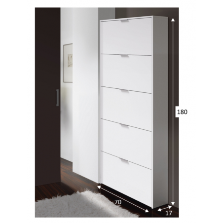 El zapatero modelo Maelys está totalmente fabricado en melamina de alta calidad color blanco, con un grosor de 10-15 mm y cantos melaminicos. Se compone de cinco puertas abatibles con sistema de cierre ABS y tiradores de aluminio, dentro de cada una de ellas tiene una bandeja en color blanco. Todo esto asegura una capacidad total de 15 pares de zapatos aproximadamente. Es muy práctico y funcional, para todo tipo de ambientes.